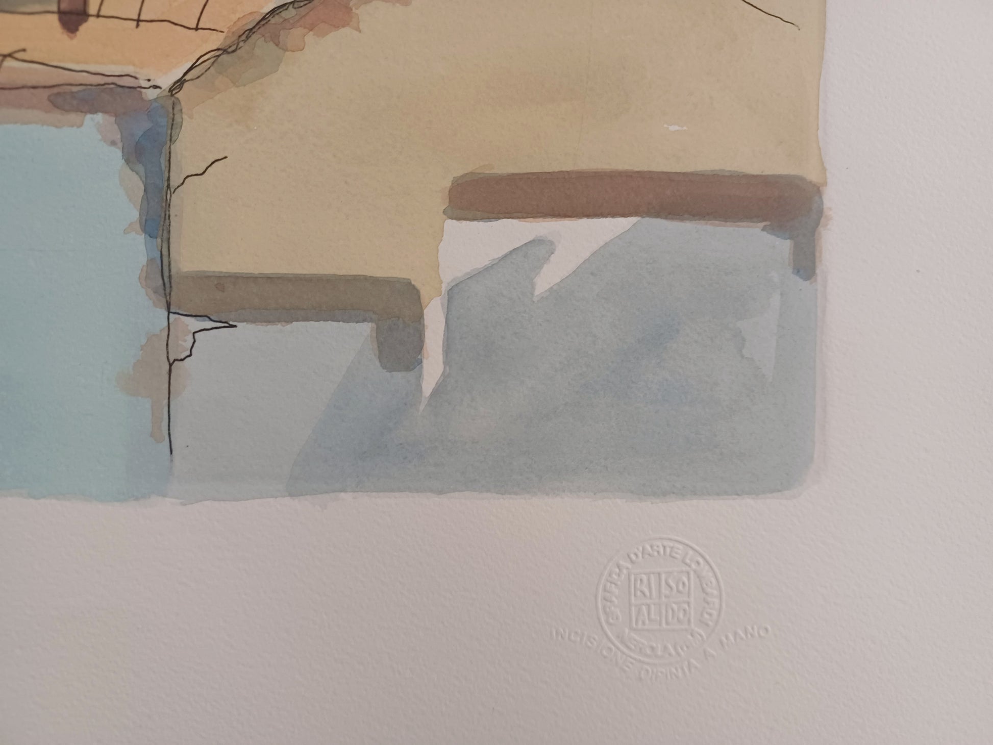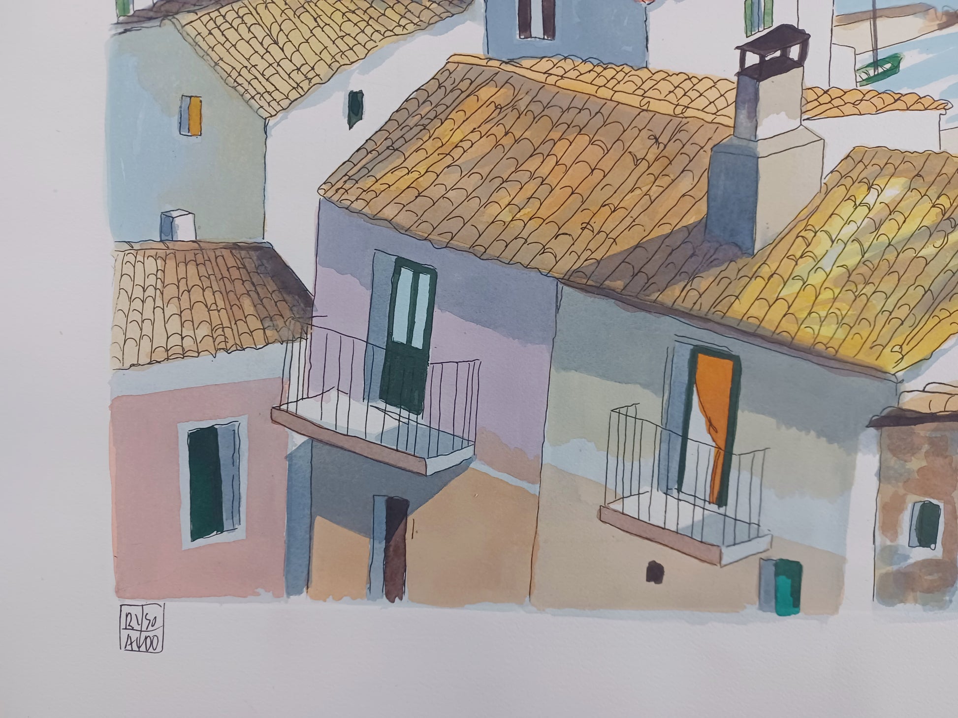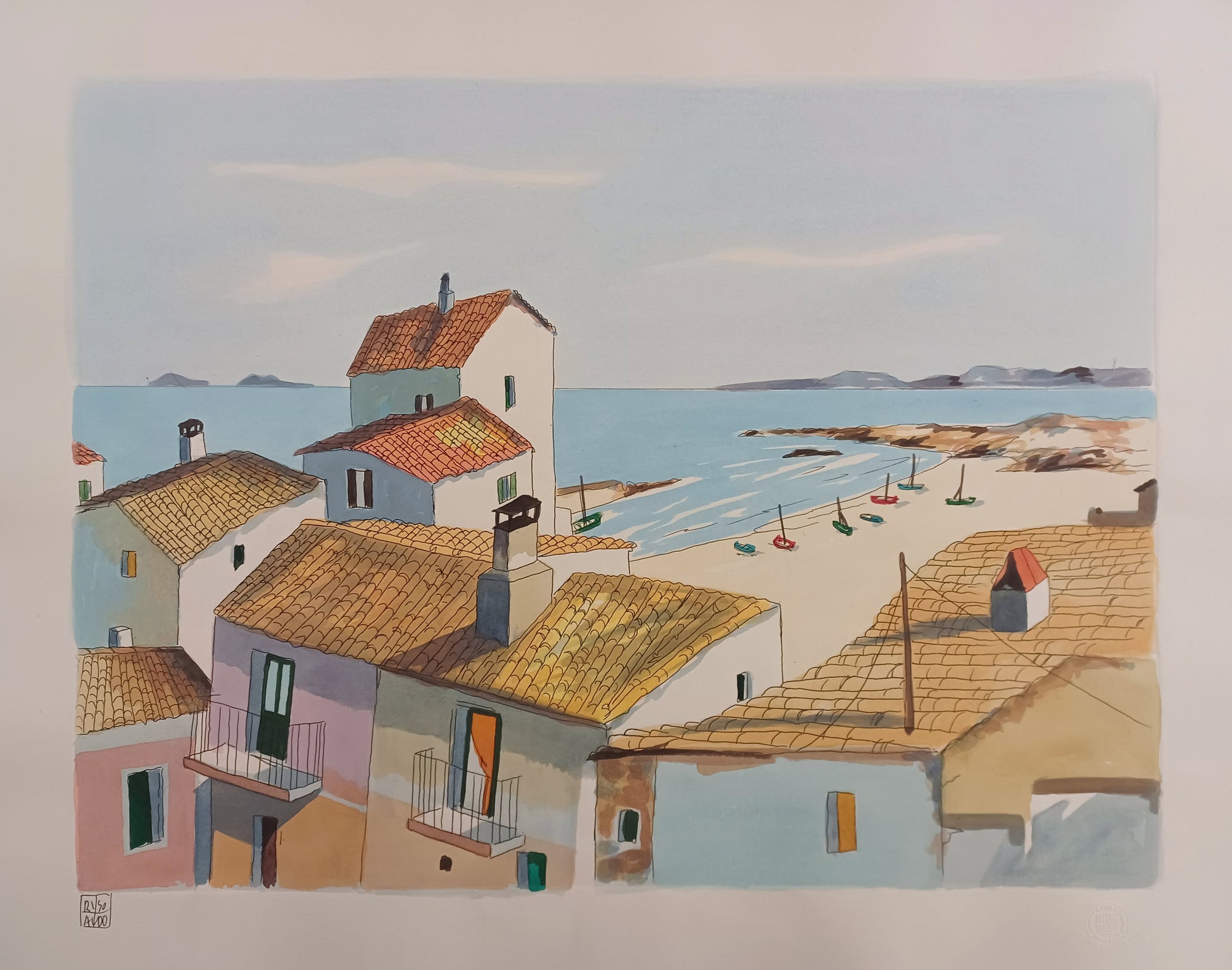 ALDO RISO - Serigrafia acquerellata a mano - Tetti sul mare - 60X80 cm