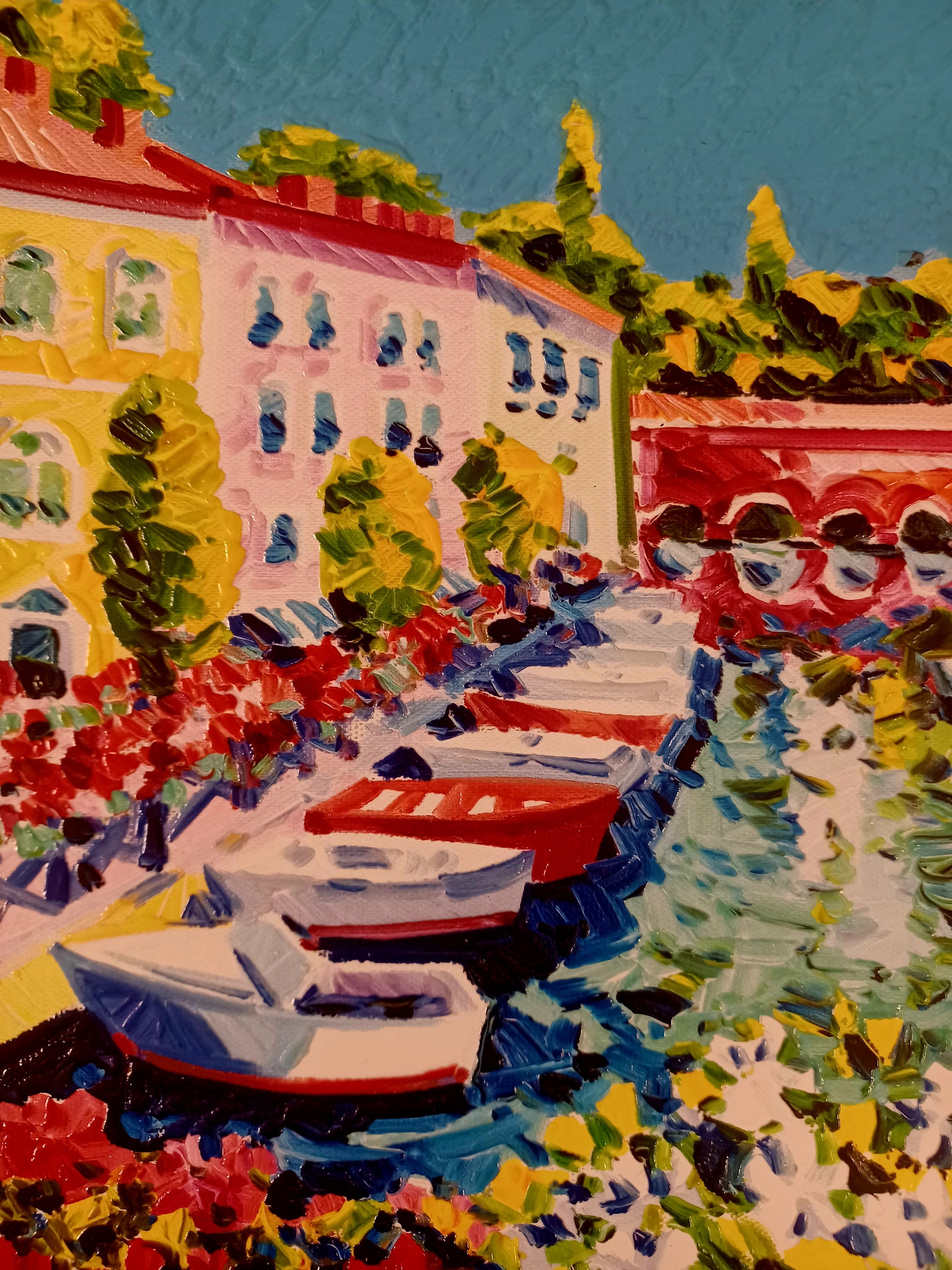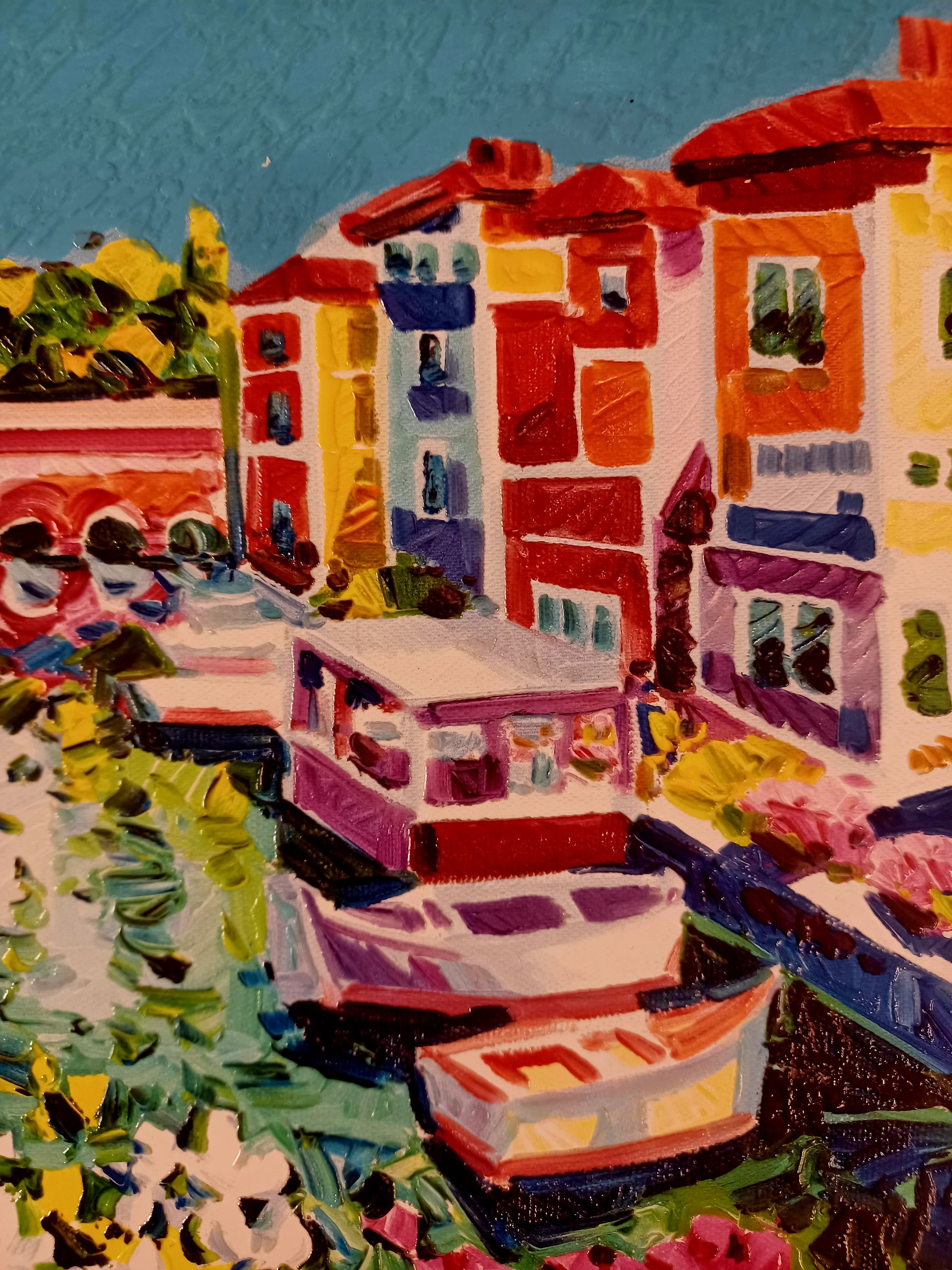 Serigrafia polimaterica su cartoncino rigido a 40 passaggi di colore. Lo stile quasi impressionista, i colori usati accesi. Ogni lavoro dell'artista ha delle linee guida: il sole alto, la luce e il racconto semplice.