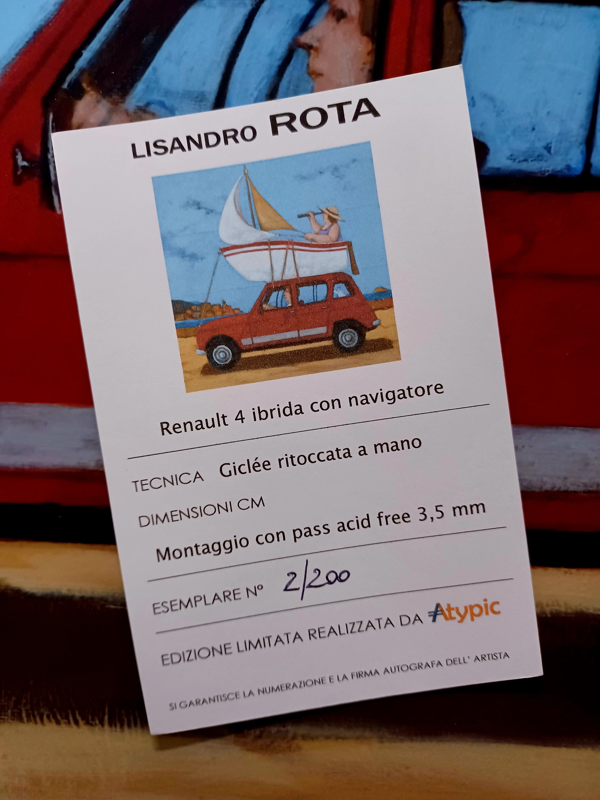 Glicèe ritoccata a mano dell'artista LISANDRO ROTA dal titolo "Renault 4 ibrida con navigatore". L'opera è montata su pannello a filo immagine e misura 50X50 cm, pronta per l'incorniciatura. Edizione limitata, esemplare 2 di 200.